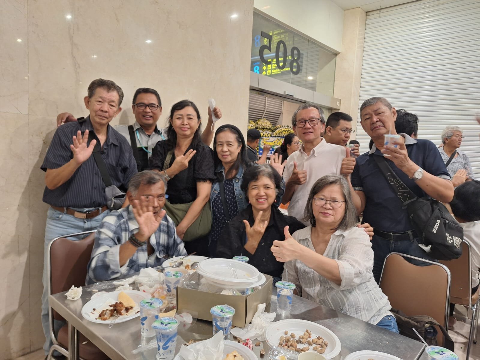 Naik lift menuju lantai 8, lantai spesial tempat para jenazah disemayamkan, ke ruang n. 805. Lalu kami masuk ke ruang jenazah pak Toto Wijaya disemayamkan, astaga …… penuh sesak banyak para pelayat bercampur baur, baik orang dengar maupun teman2 Tuli dari berbagai komunitas antara lain anggota Gerkatin Jakarta, anggota perkumpulan alumni SLB lain ( Santi Rama, Cijantung, Karya Murni, Pangudi Luhur ) ……(maaf)…. suasananya seperti sedang “berpesta” ! Mereka berbaur sedang makan malam di samping berlangsungnya kebaktian Kristen dalam satu rungan. Astagaaa….. !