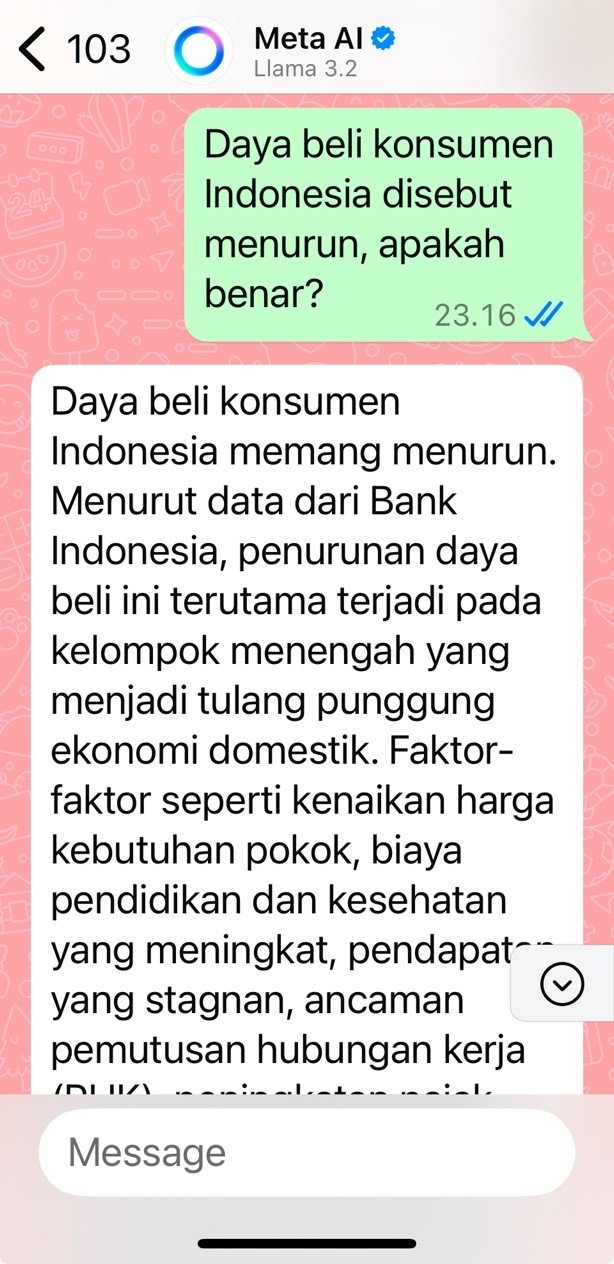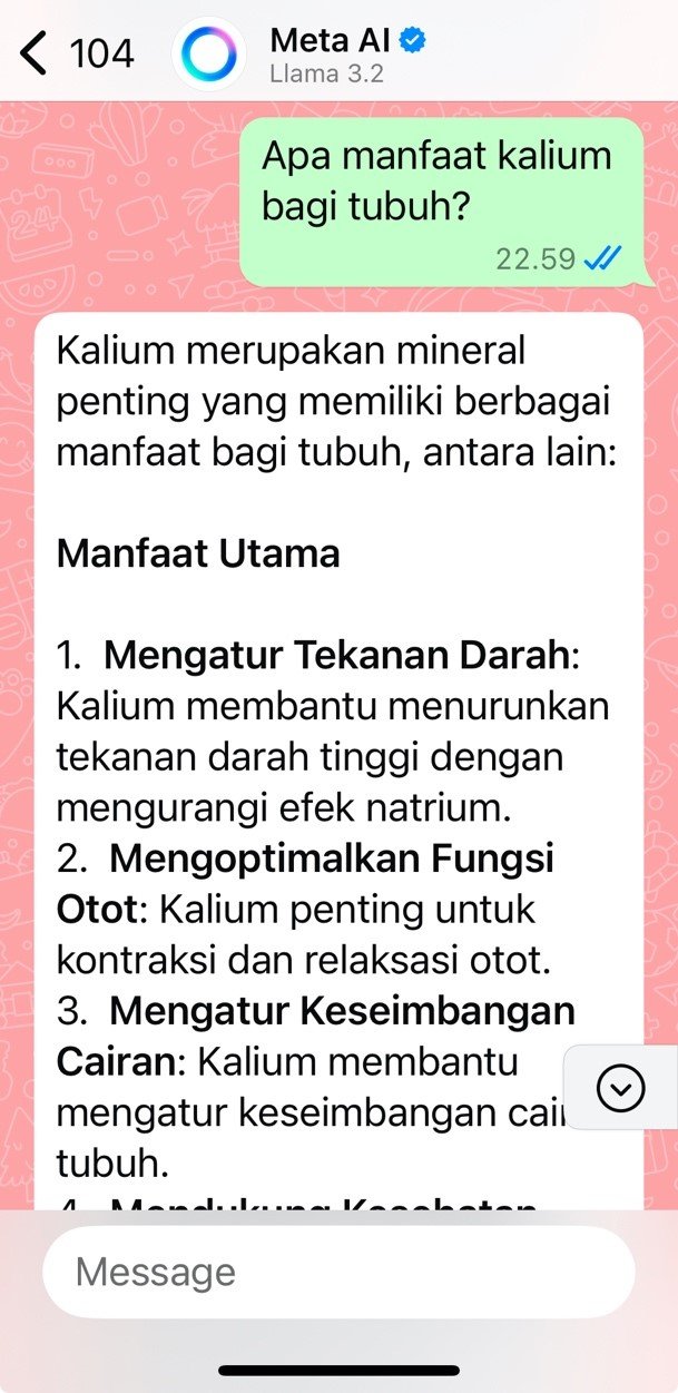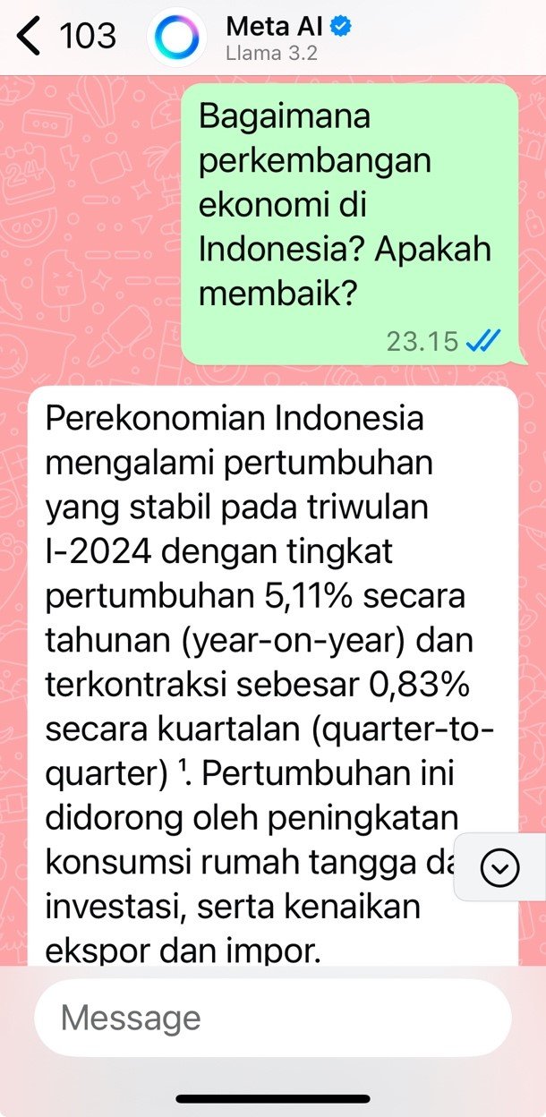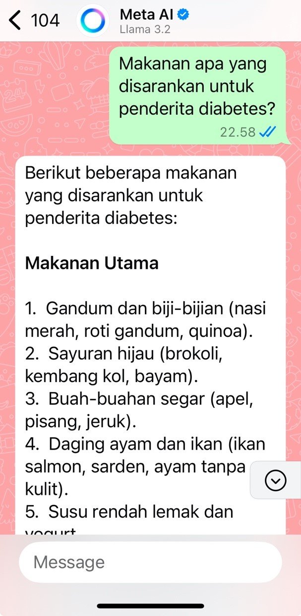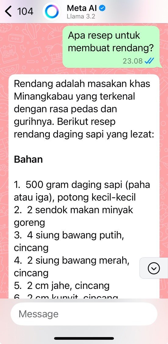 Untuk catatan, hindari memberi data pribadi misal nomer KTP, nomer rekening, nama-nama anggota keluarga. Bisa bertanya mengenai hal-hal umum saja yang ingin diketahui. Meta AI bisa membantu kita menambah pengetahuan dan informasi tanpa repot-repot googling. Gunakanlah teknologi AI dengan bijak untuk hal yang baik. Ayo dicoba, jangan ragu. Perluas pengetahuan kita.