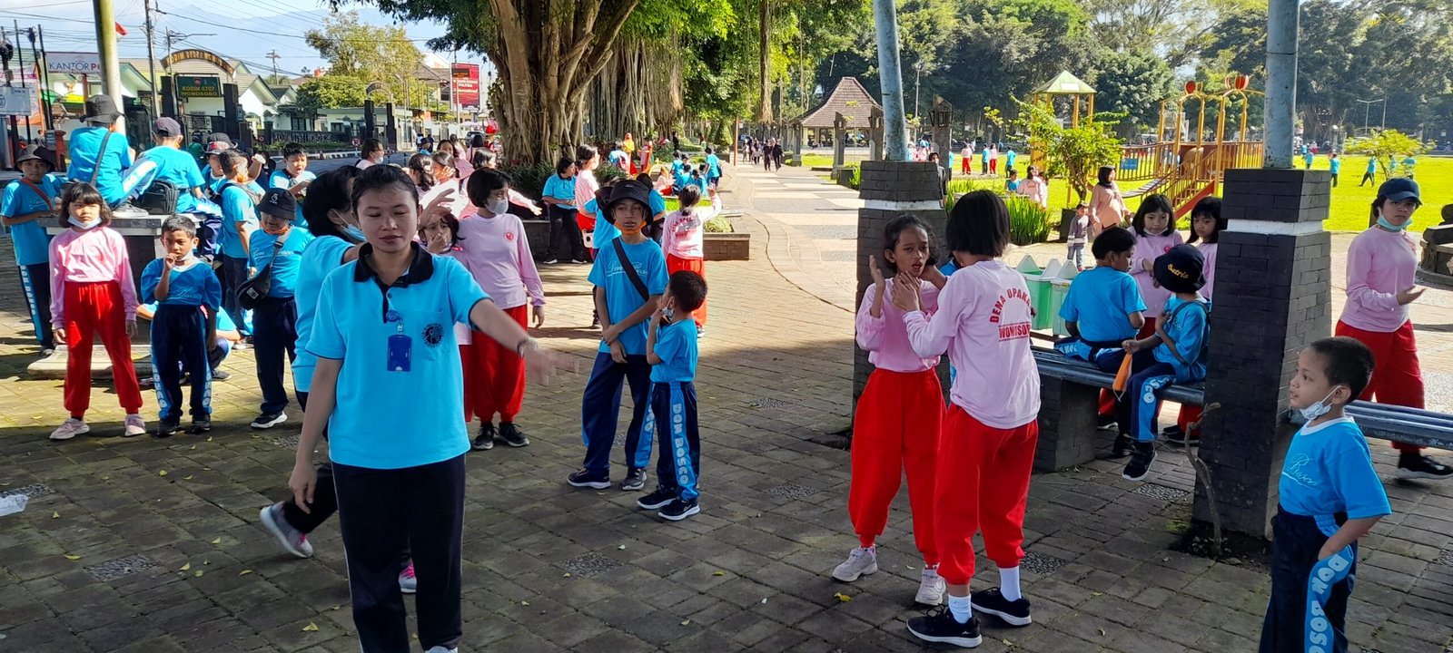 Hari Sabtu pagi, anak-anak Don Bosco sudah bersolek. Mereka merapikan baju tatanan rambut dan harum parfumnya sudah tersebar di segala penjuru. Pukul setengah delapan mereka bersiap. Ada satu budaya yang ditanamkan oleh para guru yaitu kakak menggandeng adik-adiknya yang masih kecil. Kakak-kakak harus menjaga adiknya sepanjang perjalanan menuju lokasi yang sudah disampaikan oleh koordinator. Sabtu pada Minggu terakhir bulan lalu, lokasi anak-anak Don Bosco bertemu dengan rombongan dari Dena Upakara adalah di Alun-Alun Wonosobo. Tak butuh waktu lama untuk tiba di lokasi.